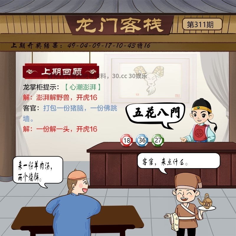 312期:【本草纲目】破解龙门客栈 掌柜:激昂慷慨 解释:意思是形容情绪激动,精神振奋,充满正气 小二:客官,好的 解释:无 客官:来份双人火锅 解释:双人火锅解双数的生肖虎、鼠、狗、猴、马、龙 特肖:牛虎鼠蛇狗兔龙马猪 |